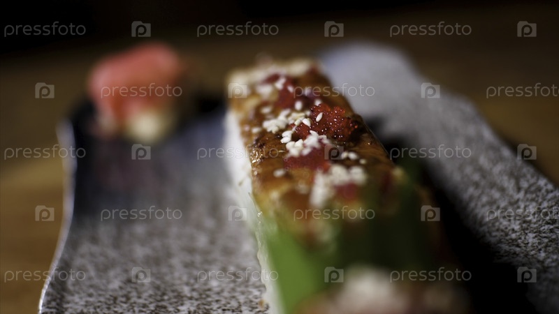 Потерять для рулонов суши на черной подносе, стоящей на столе, японская традиционная еда. вкусные украшенные роллы лежат на тарелке с розовым имбирем