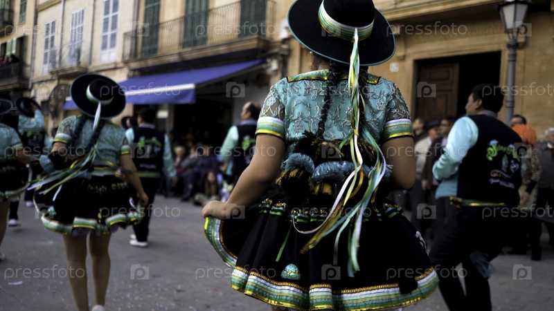 El Dia de los Muertos, Мексика, люди в национальных костюмах танцуют на улице города во время карнавала