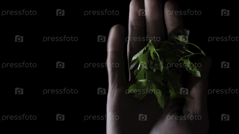 Листья петрушки в руке на черном фоне