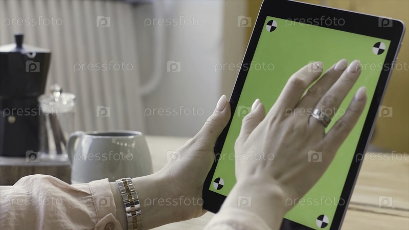 Женщина нажимает, пока прокручивает планшетный компьютер с зеленым экраном. резервная запись. Вид молодой женщины с плечом, работающей со своим устройством, хромовый ключ