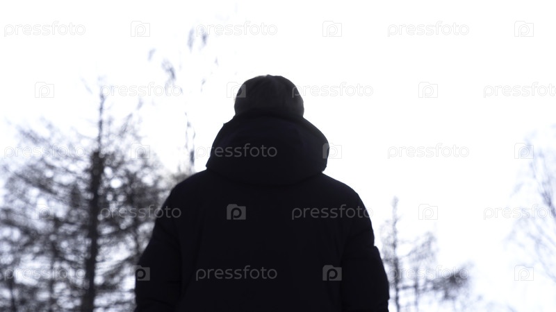 Сзади мужчина в теплой куртке стоит и смотрит на деревья, серое яркое небо и человека, дышащего воздухом в холодную погоду