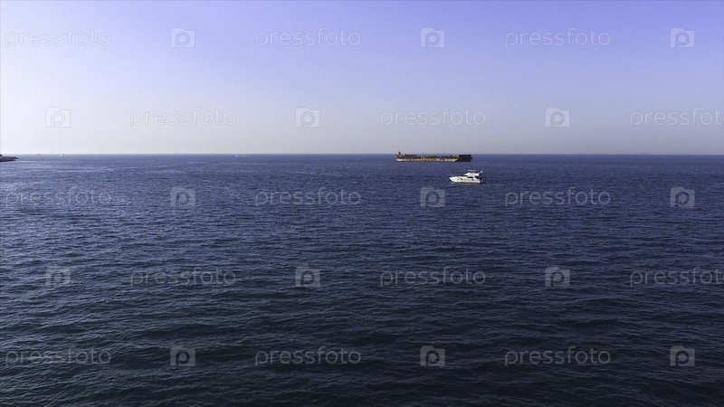 Вид с воздуха на красивый морской пейзаж с белой яхтой и темной баржей на фоне голубого неба.Сток.Прекрасное спокойное море в солнечный день с двумя плавающими кораблями
