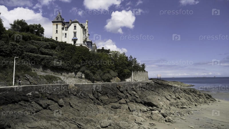 Скалистый берег с пляжным коттеджем недалеко от океана с людьми, идущими по скалистой набережной. резервные кадры. Впечатляющий морской пейзаж с красивым белым домом, зелеными деревьями и прогулкой