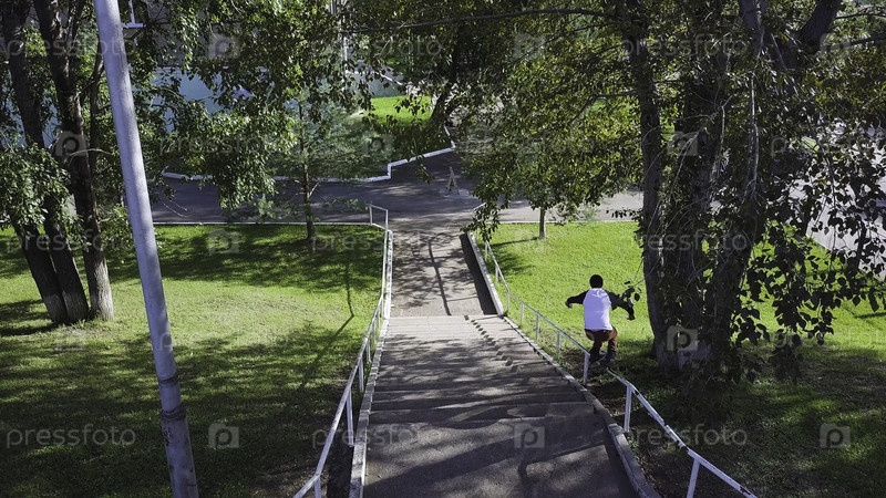 Обратный вид ролика подготовлен для прыжков в парк. Клип. Ролик прыгает на перила в парке