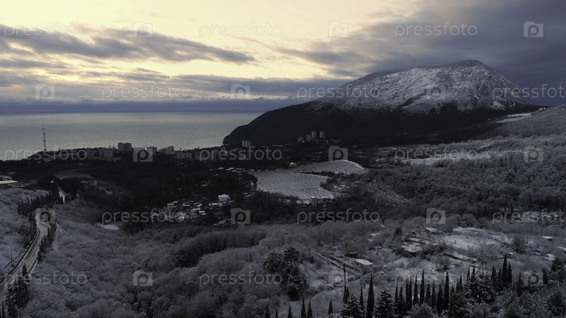 Панорамный вид на городскую прогулку и высокую снежную гору при закате.Стрельба.Воздух для прибрежного города, зимние деревья и поля, высокая гора, покрытая снегом против синего моря