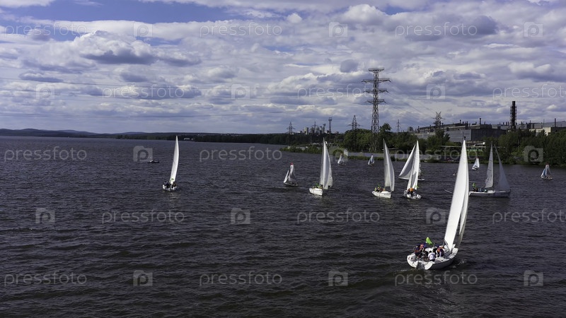 Вид с воздуха парусных яхт в пруду с волнами на поверхности воды. видео. красивые регаты плавают на фоне зеленого побережья промышленного района города