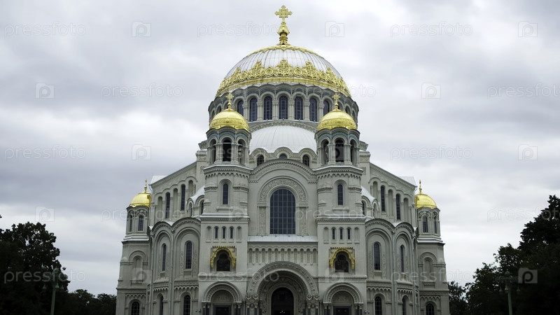 Морской собор Святого Николая в Кронштадте, Санкт-Петербург, Россия Концепция.Впечатляющая белая церковь с золотыми куполами на облачном небе, тема религии и архитектуры
