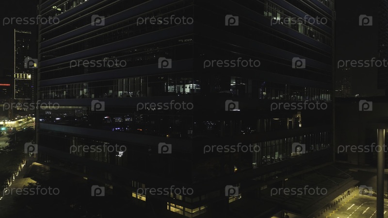 Фронтальный вид ночного фасада здания с большим количеством освещенных окон. Стрельба. Фасад многоэтажного стеклянного и стального здания, офисы и работники внутри, ночная жизнь города