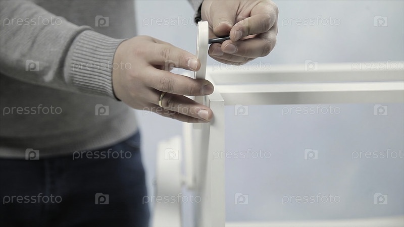 Человек собирает мебель в мастерской.Сток.Наклеивание и сборка мебели на деревянные булавки