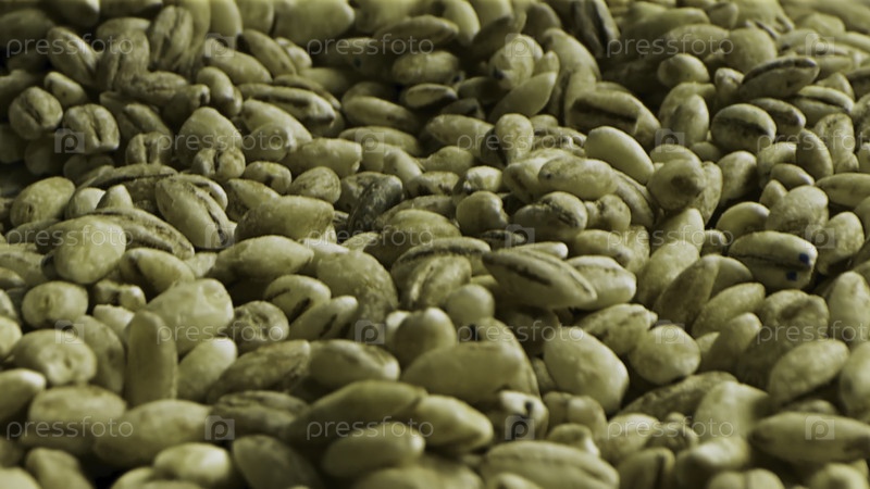 Концепция здорового питания, куча зеленых не обжаренных премиальных кофейных зерен Арабы, лежащих на плоской поверхности