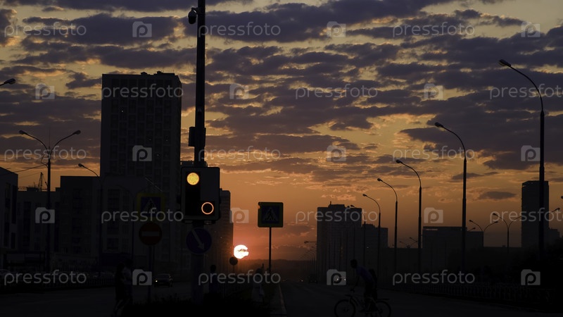 Ярко-оранжевый закат над городом вечером Концепция яркий закат и силуэты многоэтажных зданий и домов на городской улице, летний вечер