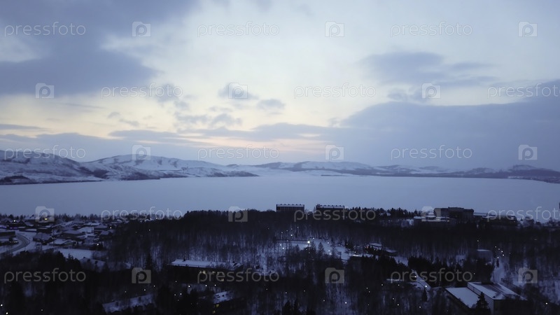 Воздушный драматический зимний пейзаж над городом покрыт белым снегом в вечернее время зимнего сезона.Путешествие через замерзшее белое озеро, деревья и здания на фоне голубого облачного неба