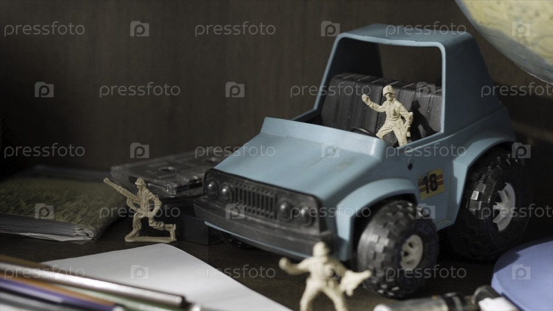 игрушечный солдат. пластиковая зеленая армейская машина на поле боя. миниатюрные солдаты-игрушки