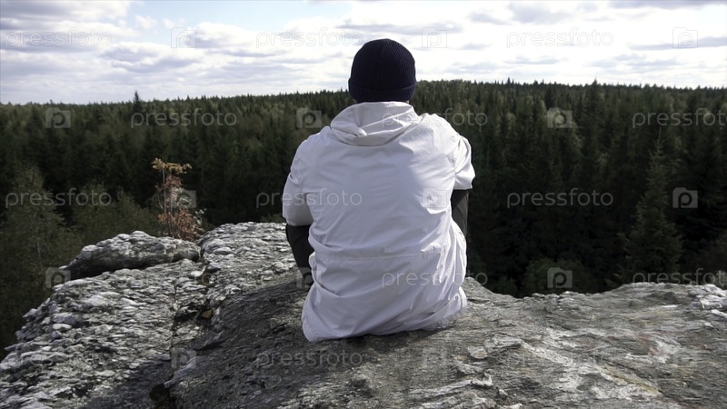 Одинокий мужчина сидит на вершине высокой горы, смотрит в облачное небо и вершины деревьев