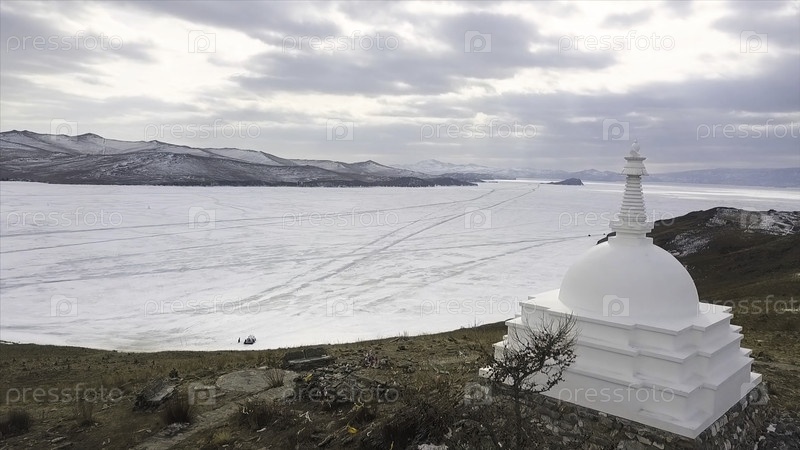 Культура и традиции Сибири, белая ступа на замерзшей воде озера Байкал на фоне места божественного просветления