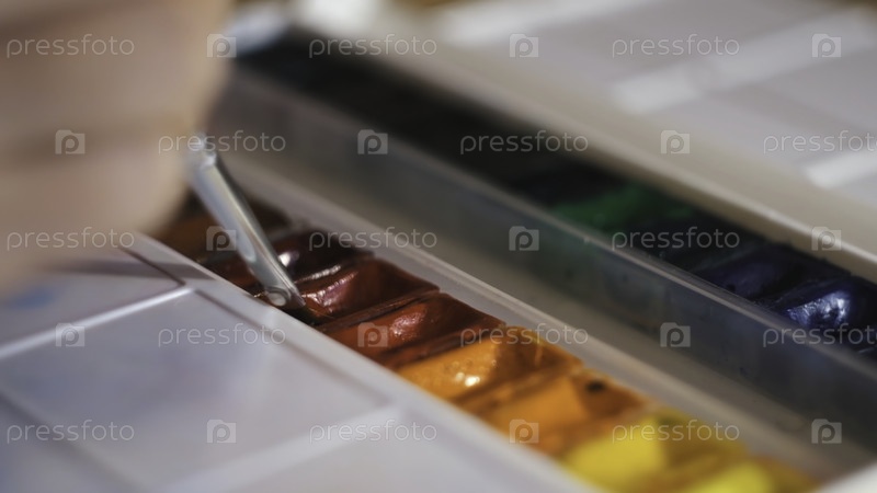 Поместите краску в цветные масляные краски.Концепция.Закрывайте руку художника, держа кисть и смешивая цвета на чистой белой палитре с водой