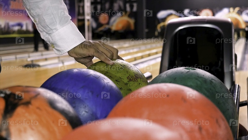Покрывайте руку человека, принимающего мяч, прежде чем бросать его во время боулинга в боулинг-клубе. СМИ. Концепция спорта и развлечений, человек, берущий мяч с прилавка