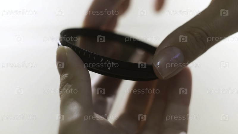 Закройте фильтр поляризующих линз в руках девочек, изолированных на белом фоне.Женщина превращается в фильтр объектива с обеих сторон