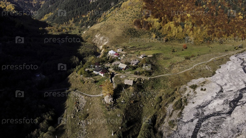 Панорамный вид из воздуха на небольшую горную деревню со старыми домами.Фильм.Зелёные и желтые осенние деревья, растущие с одной стороны склона вечером при закате солнца в Колорадо