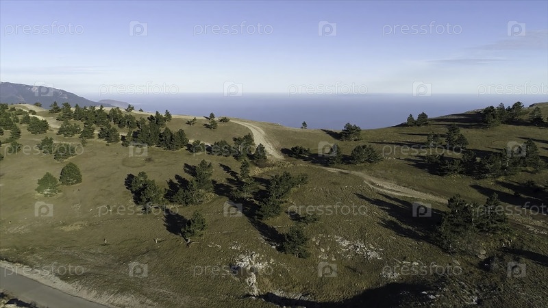 Воздух для сельской дороги с движущейся машиной среди зеленых елей и сосен в солнечный день. Красивый пейзаж желтого поля с зелёными деревьями и широкими дорожками