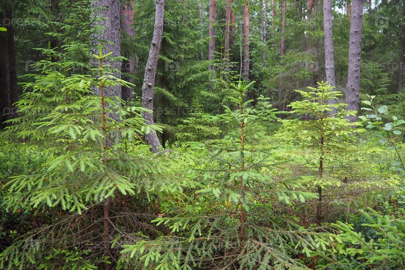 В биоме тайги доминируют хвойные леса. Пицея пирс, род хвойных вечнозеленых деревьев семейства Pinaceae. Карелия, Оржега. ветви сперсы качаются при сильном ветре в солнечную погоду