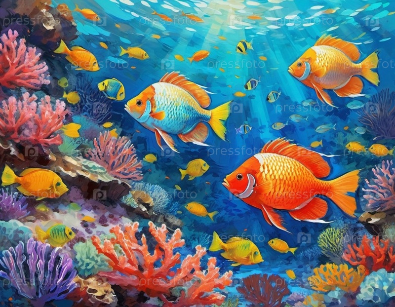 Ярко-оранжево-бело-жёлто-красные рифовые рыбы плавают через коралловый риф. Солнечные лучи проникают в морскую воду. Разнообразие животных. Экология гидросферы. Антропогенный фактор, влияющий на смерть коралловых рифов. AI
