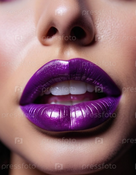 Клубовый снимок женских губ с мерцающей фиолетовой помадой, которая добавляет прикосновение глянцевого оттенка. Губы слегка расставлены между собой, открывая вид белых зубов. чувственность и сексуальность генерируются