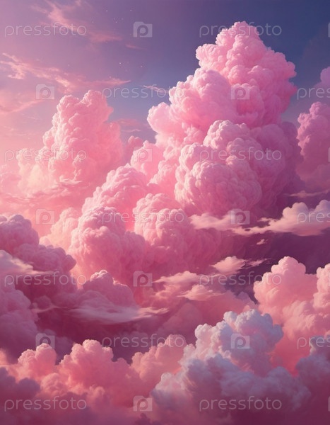 Красивый вид розовых облаков на ярком закате неба. Облака пушистые и полные света, создавая потрясающий визуальный дисплей. Драматическое нереальное небо с кумулярными и пластовыми облаками в атмосфере