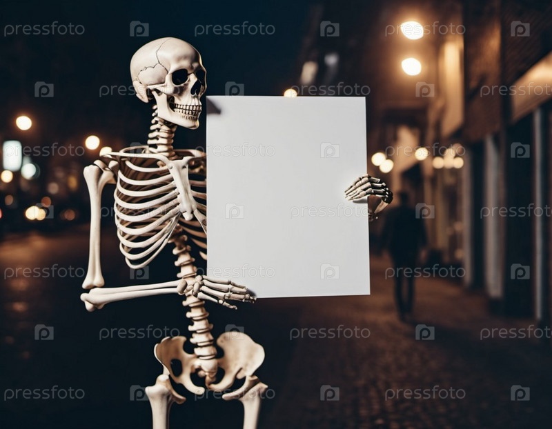 Фигура скелета держит белый плакат. Сгибающиеся руки скелета предоставляют достаточно места для любого сообщения или дизайна