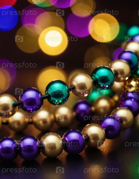Красочные бусы в фиолетовом, зеленом и золотом цветах создают праздничную атмосферу, когда они лежат на сверкающем фоне боке, воплощая радостный дух новогодних каникул Марди Граса в Новом Орлеане