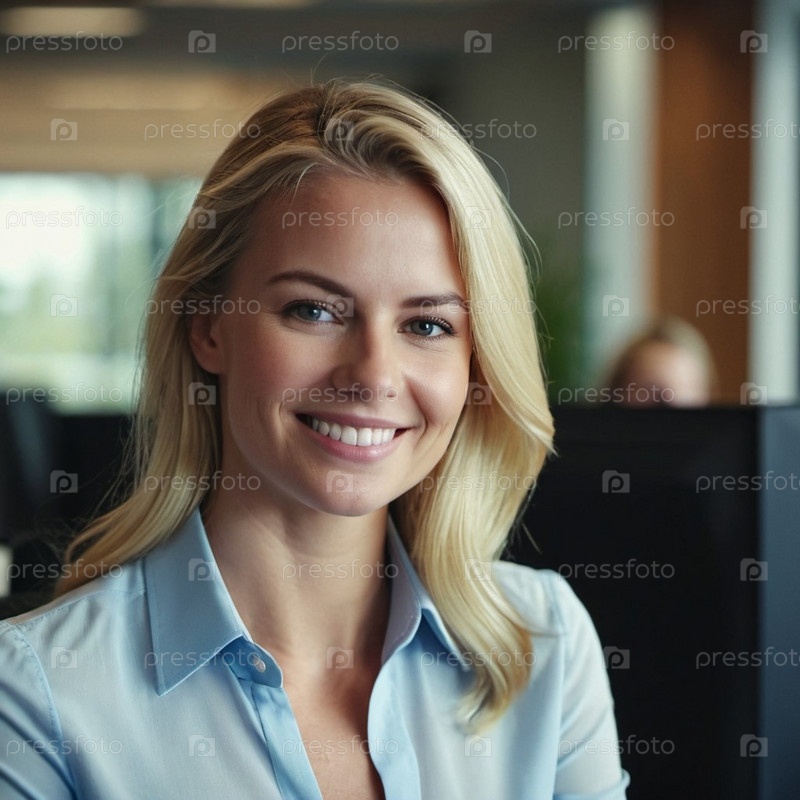 Профессиональная блондинка, одетая в светло-синюю рубашку, сидит за своим столом в современном офисе, излучающем уверенность и позитив