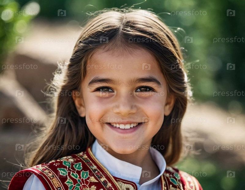 Молодая улыбающаяся 5-летняя девочка таджикской национальности стоит на улице, одетая в традиционную одежду