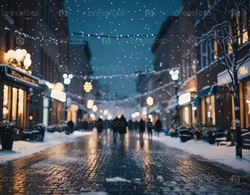 Спокойный зимний вечер окутывает городскую улицу, где медленно падающий снег усиливает сияние рождественских огней. Праздничная атмосфера привлекает людей, празднующих Новый год