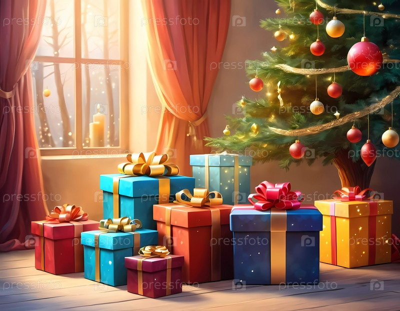 Декорированная рождественская елка, украшенная красочными драгоценностями и наложенными подарками, готова отпраздновать в уютной праздничной атмосфере. упакованные подарки различных цветов. праздничная атмосфера, теплота и радость. AI