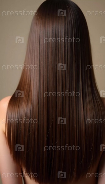 Гладкие, прямые коричневые волосы грациозно протекают внизу, подчеркивая его здоровый блеск и равномерный цвет, освещенные мягким освещением, создавая поразительный вид