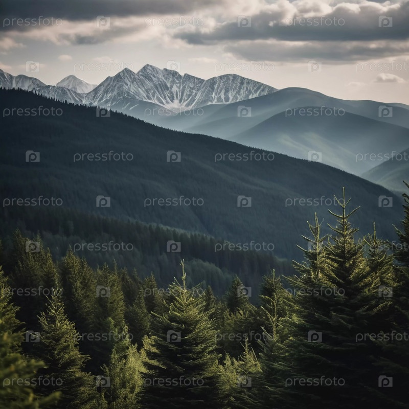 Величественные горы возвышаются над безмятежным пихтовым лесом под драматическим небом, показывая красоту природы на закате. высокие горы с холмами и мрачное небо освещают мирную пустыню