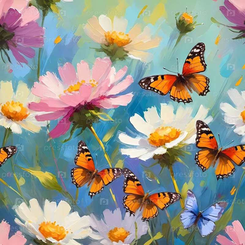 Красочные бабочки грациозно парили над ярким массивом диких цветов, создавая живую и веселую атмосферу на солнечном лугу