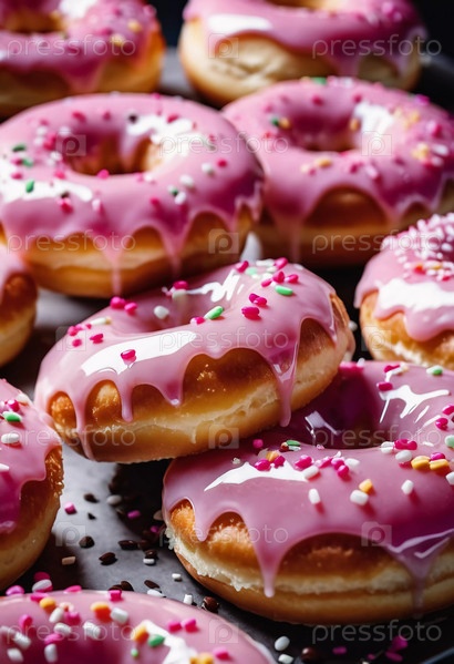 Вкусные клубниковые розово-зеленые глазурные пончики выставляются на деревянном фоне.Посыпы и украшения из конфет добавляют яркие цвета, создавая праздничное лакомство