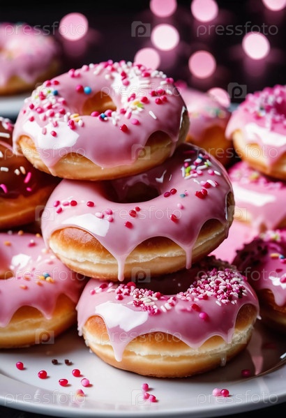 Вкусные клубниковые розово-зеленые глазурные пончики выставляются на деревянном фоне.Посыпы и украшения из конфет добавляют яркие цвета, создавая праздничное лакомство