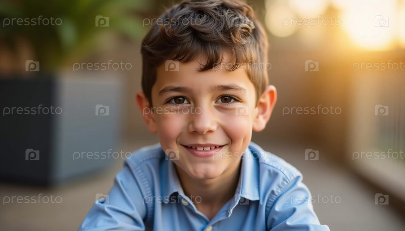 Мальчик в Израиле излучает счастье, сидя на солнцезащитной палубе и показывая яркую улыбку