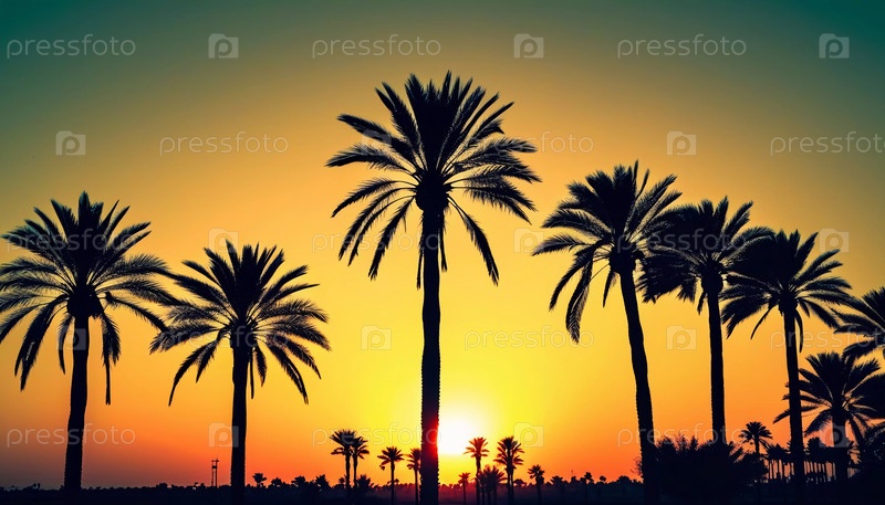 Золотые оттенки плавно сочетаются с богатым апельсином и фиолетовым, когда солнечный свет опускается за силуэт пальмы, захватывая суть спокойного вечернего момента генеративного ИИ