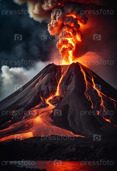 Вулканическое извержение освещает пейзаж, поскольку расплавленная лава течет вниз с горы и облака золы плавают над ней, создавая потрясающее зрелище