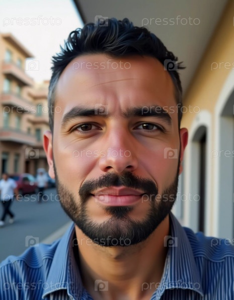 В оживленном районе Газы палестинский мужчина уверенно стоит, демонстрируя свою привлекательную улыбку среди шумных улиц и теплого солнечного света, захватывая местную жизнь