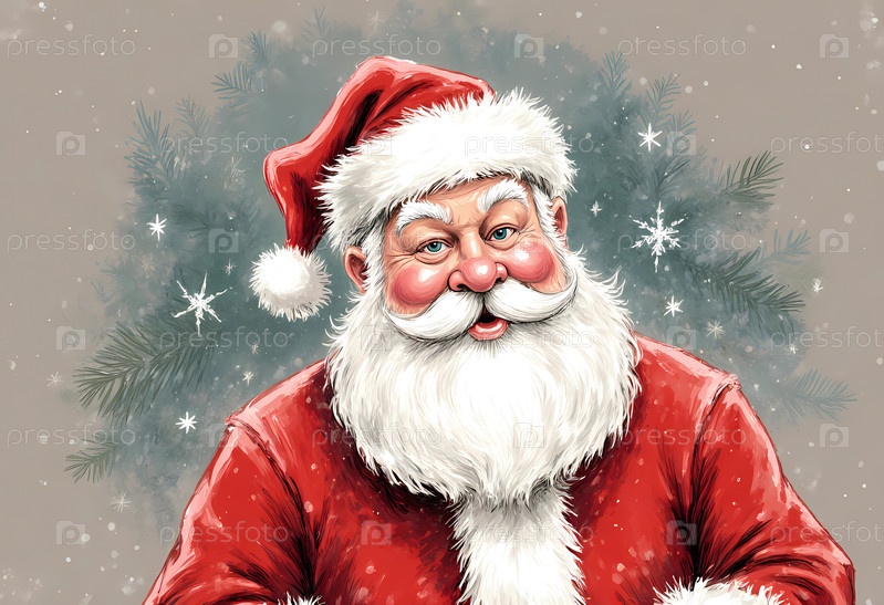 Санта излучает радость, надевая ярко-красный костюм и пушистую белую бороду.Он стоит на фоне мягких снежин, воплощая дух праздничного сезона Generative AI