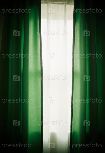 Свет аккуратно фильтруется через ярко-зеленые шторы в теплой помещенной среде, создавая спокойную атмосферу, которая предлагает расслабление и комфорт