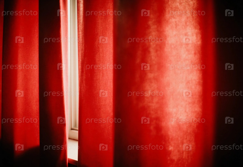 Мягкие световые фильтры частично покрасили красные шторы в уютной комнате, создавая теплую атмосферу, идеальную для отдыха или чтения в конце дня