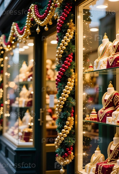 Ювелирный магазин демонстрирует очаровательную витрину с праздничными украшениями, искрящимися огнями и потрясающими драгоценностями, готовыми к рождественскому сезону генеративного ИИ