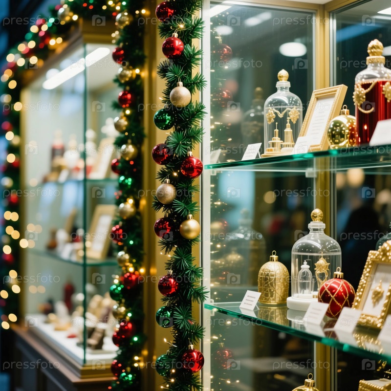 Ярко освещенная витрина в праздничном магазине выделяет красивые рождественские и новогодние декорации.Красочные украшения, стеклянные контейнеры и искрящиеся огни создают радостную атмосферу генеративного ИИ