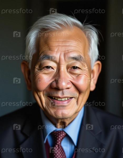 Пожилой китайский мужчина нежно улыбается, показывая линию опыта на его лице.Облеченный в официальную одежду, он излучает тепло и мудрость в мягко освещенной комнате