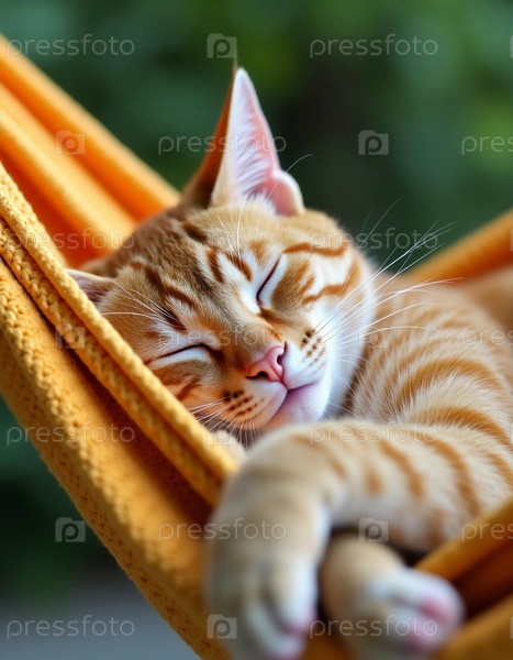 Солнечный свет фильтрует листья, когда оранжевый полосатый кот скручивается в красочном гамаке и наслаждается спокойным сном